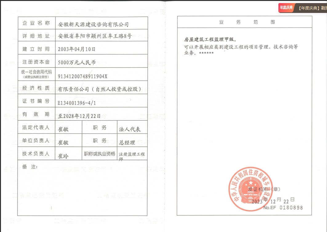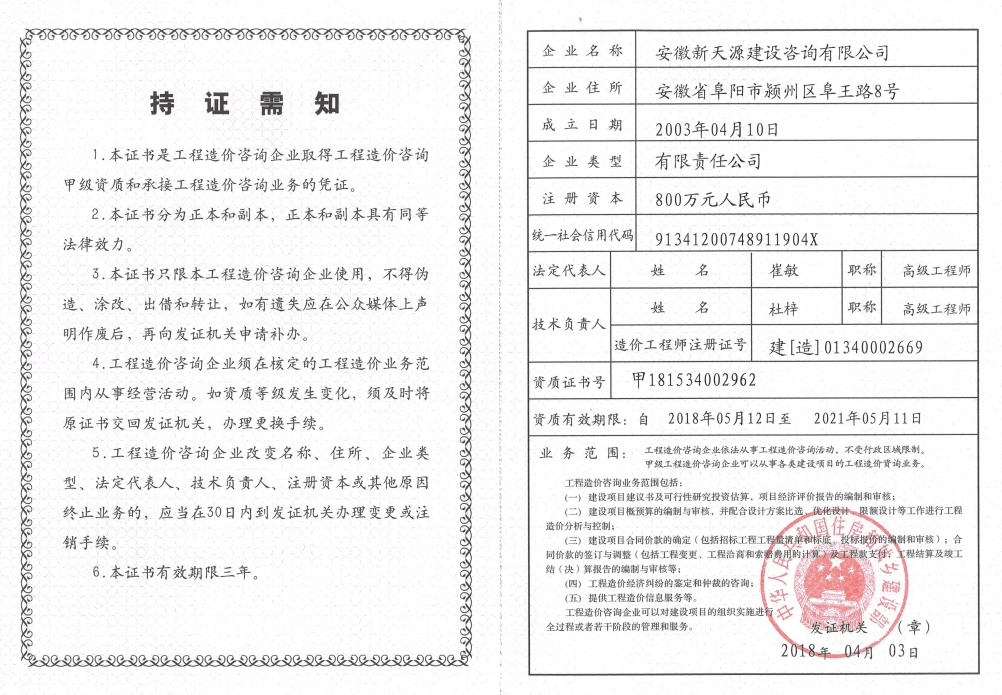 公司成立于2003年4月10日,為股份制企業(yè),現(xiàn)注冊資金5000萬元,辦公面積2200多平方米,法人代表崔敏。在成立同年,公司取得了國家發(fā)展改革委員會頒發(fā)工程咨詢資格證書,并成為安徽省工程咨詢協(xié)會會員單位。隨著近年來的不斷發(fā)展壯大,公司相繼取得了招標代理資質(zhì)證書(工程招標代理資質(zhì)資格證書、政府采購代理資格證書、水利工程招標代理資格證書、中央投資項目招標代理資質(zhì)證書)。
